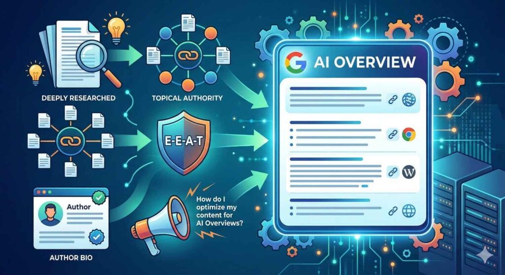 Prioritize E-E-A-T signals rigorously. Experience, Expertise, Authoritativeness, and Trustworthiness (E-E-A-T) have become even more critical in the AI search era. Author bios with verified credentials, citations from reputable external sources, original research and data, and a transparent about page all contribute to the trust signals that influence AI Overview citations.